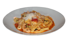 Tagliatelle con pollo Bandnudeln mit Hähnchenbrustfilet, Zucchini und Salbei, in einer Tomatenrahmsauce |